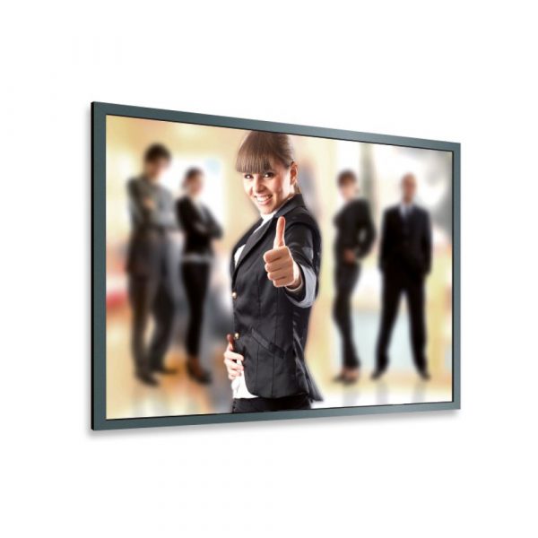 Οθόνη προβολής 16:9, 3340mm x 1876mm (viewing area), συνολική διάσταση 3,5m x 2,4m με Vision White πανί, πλαίσιο αλουμινίου 8mm μαύρο και τοποθέτηση της επιφάνειας προβολής στο πίσω μέρος του πλαισίου με κουμπιά. Διατίθεται σε format 4:3 / 16:10 / 16:9 / 21:9 και με πανιά Vision White Rear / Vision White Pro / Reference White Grey / Vision Macro Acoustic / Helios White Grey / Vision Acoustic. Περιλαμβάνει Kit στήριξης τοίχου.
