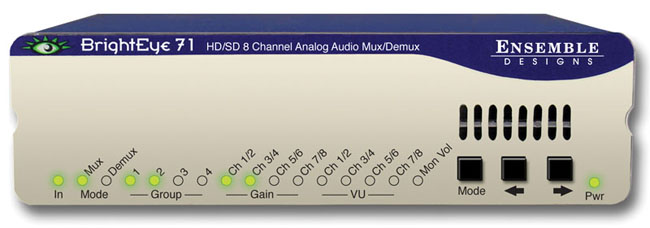 The BrightEye 71 is a dual rate eight channel analog audio embedder or disembedder for 1.5Gb/s high definition video signals or for 270Mb/s standard definition signals with Optical output. The analog audio ports automatically configure as inputs or outputs depending if the module is configured as mux or demux.
