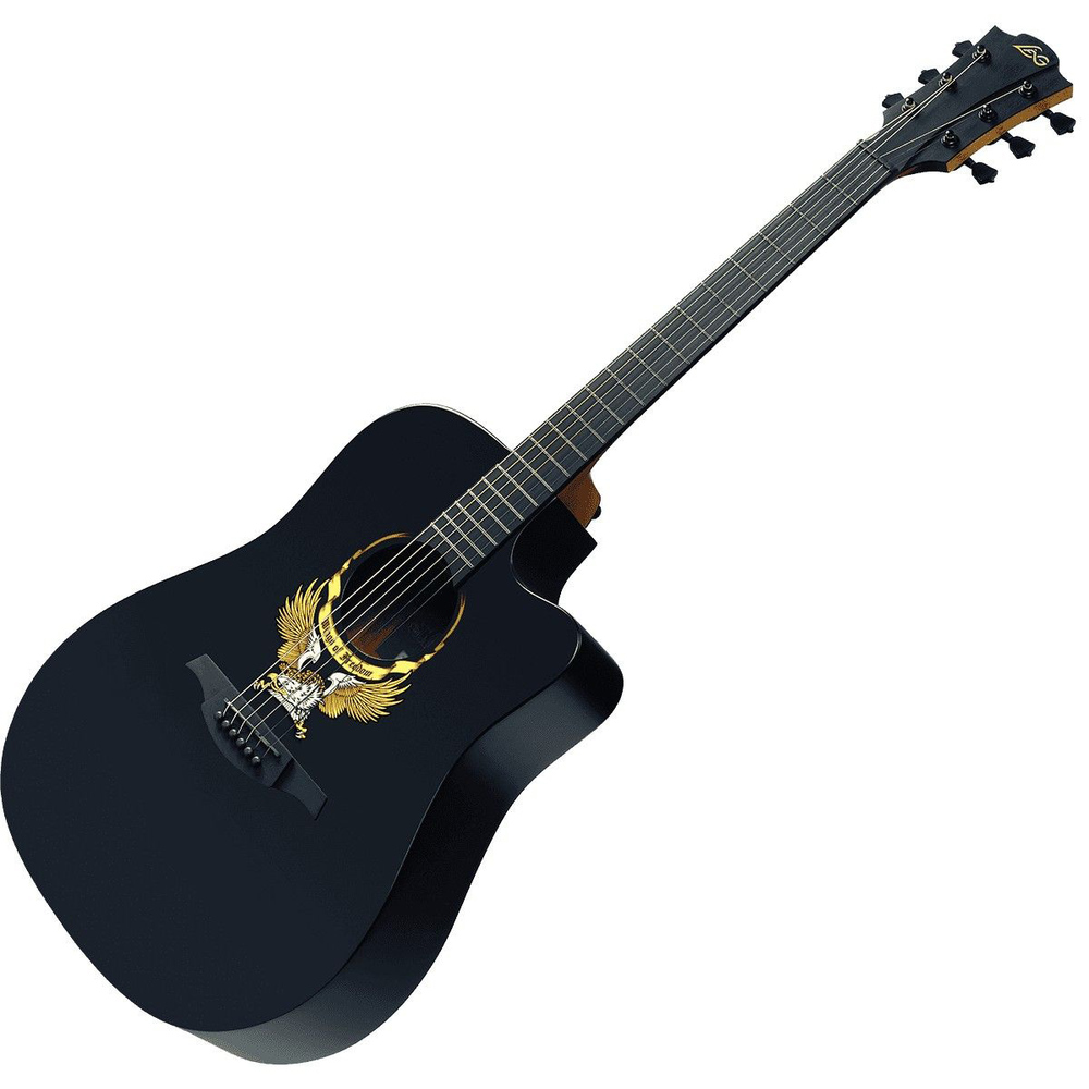 Tramontane Dreadnought Cutaway Wings of Freedom electroacoustic guitar, with Lag system preamplifier. Solid Canadian fir lid, arm, sides and back from Khaya Mahogany and keyboard from Blackwood. Black Satin metal parts, High Gloss Black color.