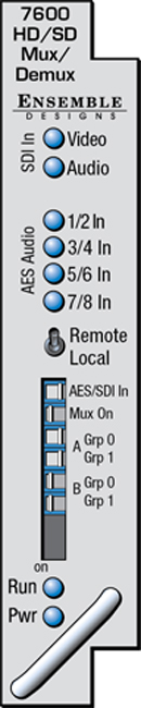 The 7600 module is a dual rate eight-channel audio embedder or disembedder for 1.5 Gb/s high definition video signals or for 270 Mb/s standard definition signals. Four AES ports automatically configure as inputs or outputs depending on if the module is configured as mux or demux.