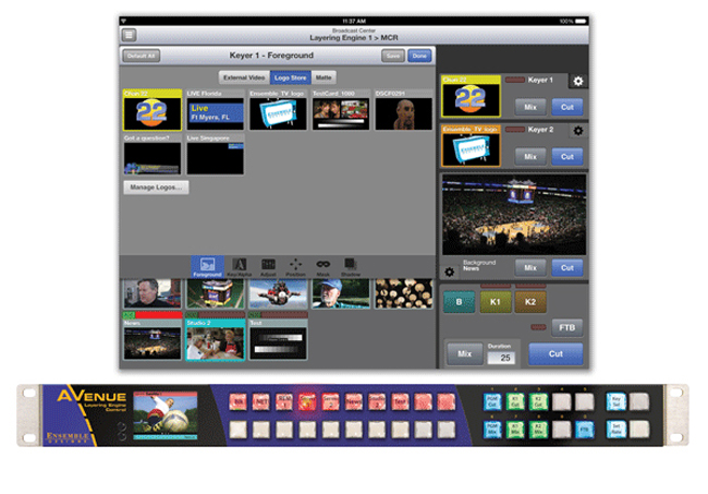 Use Ensemble’s Avenue Layering Engine for broadcast, live venues and presentation. With two, independent linear keyers, program/preset background transitions, and audio mixing and breakaway, it’s an agile and flexible solution to combining audio and video content. Inputs can be driven by SDI signals from cameras, remote feeds, character generators, graphic and stillstore systems and video servers. The full range of SDI signals from SD to HD and 3G formats are supported. Realtime processing and low latency make it easy to integrate ? even in complex signal chains.