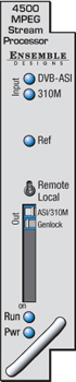 The 4500 MPEG Transport Stream Processor works with both DVB-ASI and SMPTE 310M bitstreams. It provides stream content analysis with support for both Priority 1 and Priority 2 test protocols of the ETR 290 DVB measurement guidelines. As a converter, it can translate ASI to 310M or 310M to ASI. Using the reference input, the output bitstream can be synchronized to a video or 10 MHz reference signal.