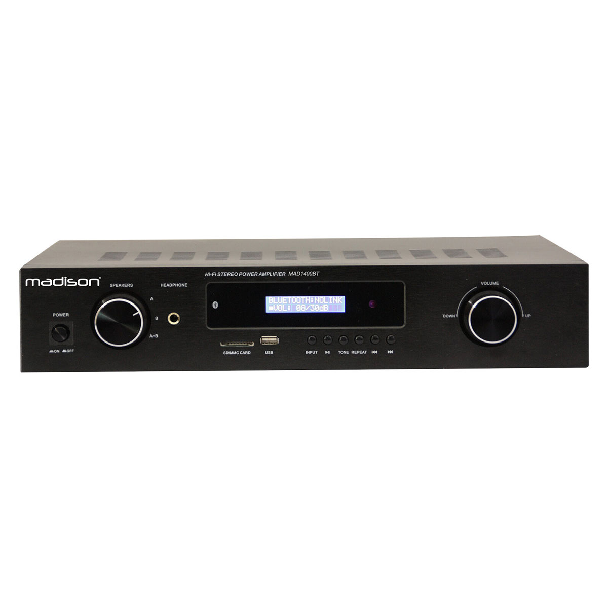 Madison MAD1400BT-BK, ενισχυτής Hi-Fi δύο καναλιών με ισχύ 2 x 100W στα 8Ω, 2 x 140W στα 4Ω και απόκριση συχνότητας 30Hz – 20kHz. Διαθέτει θύρες USB και SD για αναπαραγωγή μουσικών αρχείων, Bluetooth και λειτουργία ραδιοφώνου.