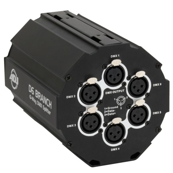 6-Way DMX Splitter & amplifier 1x DMX In, 6x DMX Out & 1 DMX Thru (all 3-pin XLR’s) Link with other D6 Branch Splitters Input & outputs are electrically and optically isolated from each other Includes two straps to securely attach to truss Clamp mount bracket included On/Off power switch Multi-voltage operation: AC 100-240V, 50/60Hz (IEC Socket) Dimensions (LxWxH): 4.75”x5”x6” / 118.5×122.5x153mm Weight: 2.5 lbs/ 1 kg.