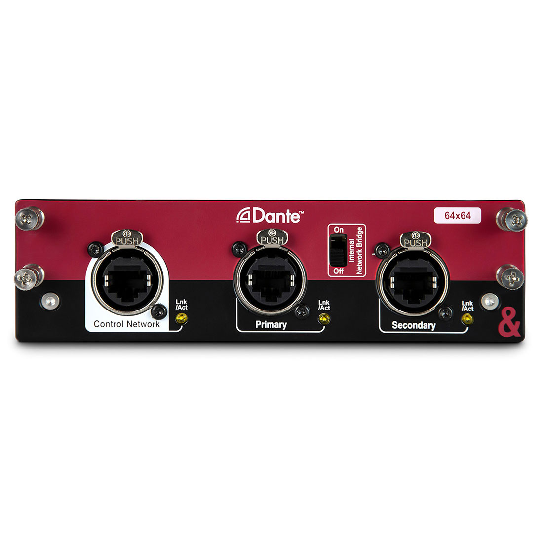 Η κάρτα Dante (M-DL-DANTE64) παρέχει 64 x 64 κανάλια σε 48kHz ή 96kHz σε L3 ethernet υποδομή. Η Dante 64 x 64 είναι συμβατή με τη σειρά dLive.64 bidirectional channels of Dante I/O at 96kHz or 48kHzPrimary and Secondary audio ports for redundancy or switched operationDedicated Control Network port for configurationInternal Network Bridge switch to bridge the dLive/Avantis Control Network and the Dante Control NetworkMultitrack recording via Dante Virtual Soundcard (available separately)64 channels at 48kHz32 channels at 96kHzAES67 compatibleDante Domain Manager (DDM) readyUp to 5x superDANTE w/ dLive S Class / Up to 2x superDANTE w/ dLive C ClassPlug and play operationUse off the shelf network hardwar
