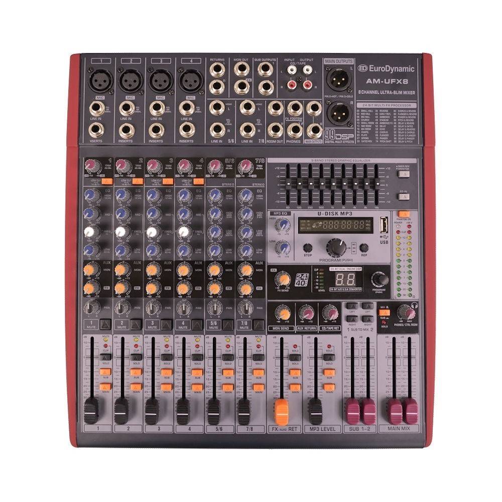 η amufx8 είναι μια κονσόλα μίξης ήχου 8 εισόδων της eurodynamic με ενσωματομένη μονάδα εφέ. χαρακτηρηστικά: – 4 είσοδοι mic/line με εισόδους xlr/jack.- 2 είσοδοι line – stereo με jack.- 1 stereo είσοδο για cd ή εγγραφέα με rca.- 1 αuxiliary έξοδοι/είσοδοι. – 1 stereo sub group έξοδος με ξεχωριστό διπλό fader ελέγχου έντασης.- 48v phantom power στις μic προενισχύσεις.- γραφικό equalizer 9 περιοχών στην έξοδο.- είσοδος για usb δίσκο και sd κάρτα με ενσωματομένο mp3 player με οθόνη lcd για την απεικόνιση του track listing. πλήκτρα χειρισμού των tracks. ξεχωριστό equalizer και ξεχωριστό volume control με fader.- μονάδα ψηφιακών dsp εφέ με 99 preset.- kάθε κανάλι διαθέτει παραμετρικό equalizer τριών περιοχών. με τα πρώτα 4 να διαθέτουν έλεγχο της συχνοτικής περιοχής στα μεσαία καθώς και διακόπτη lo cut αποκοπής των χαμηλών συχνοτήτων.- πλήκτρο σίγασης – mute και solo σε κάθε κανάλι.- οπτικός έλεγχος έντασης εξόδου με διπλό display 12 βαθμίδων.- eξοδος ακουστικών με ξεχωριστό knob έντασης.- είσοδος για έλεγχο των εφέ με ποδοδιακόπτη – footswitch. – οι σύνδεσμοι και τα βύσματα είναι της neutrik.- διαστάσεις (χιλιοστά) : 335*355*115