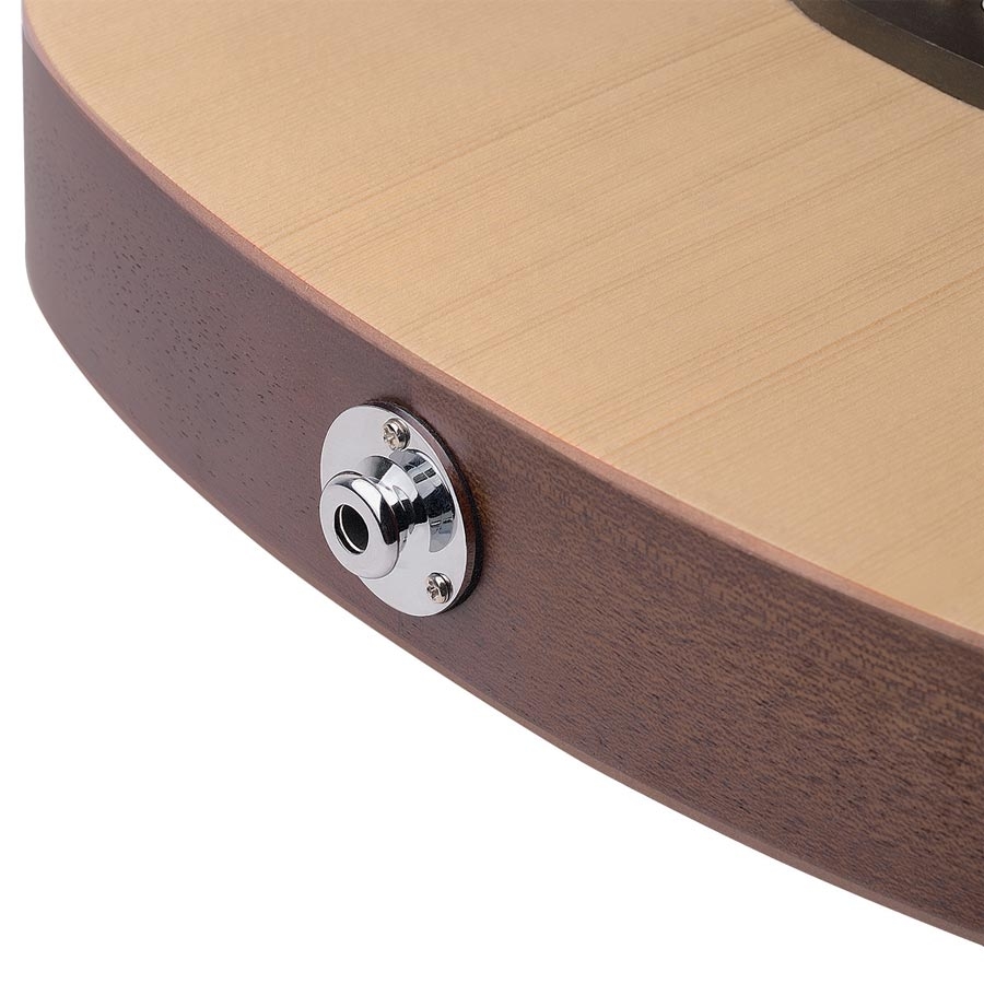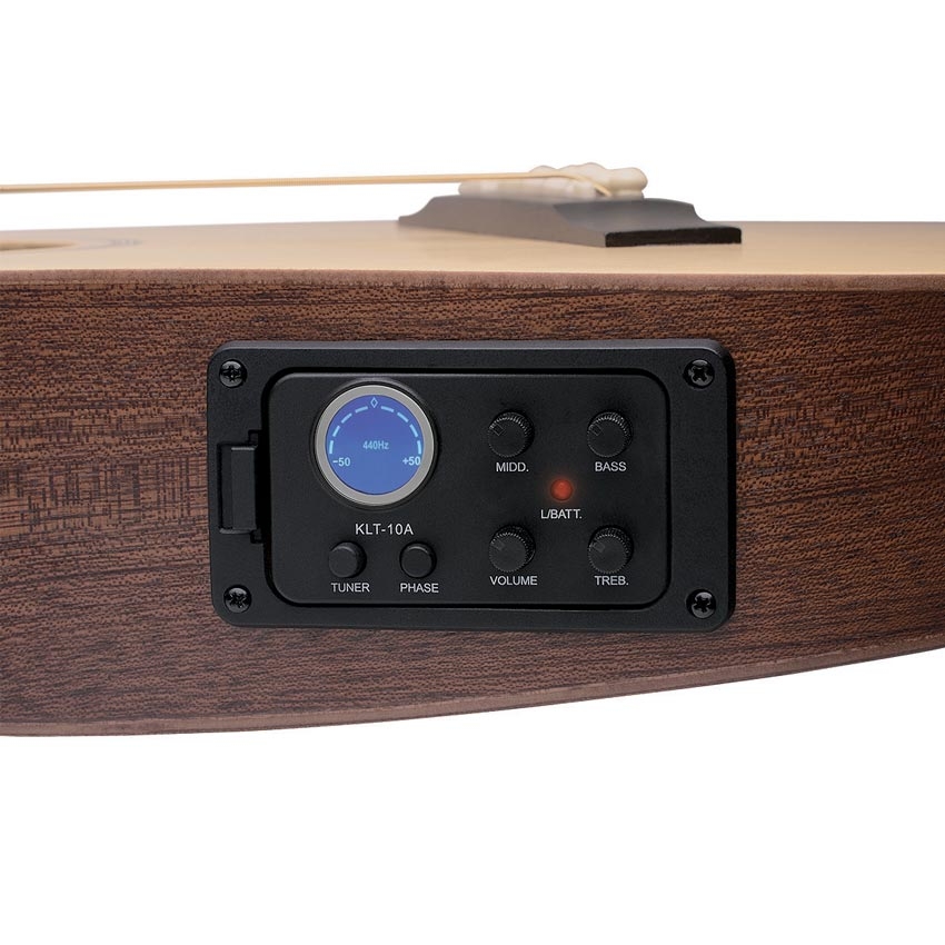 Roundback dreadnought cutaway travel guitar w/preamp Shape: 84cm roundback dreadnought cutaway Top: satin spruce Back & sides: satin mahogany Neck: mahogany Fretboard and bridge: rosewood Chromed machine heads Finish: open pore satin Capo and saddles: tusq Preamp: KLT-33 with tuner