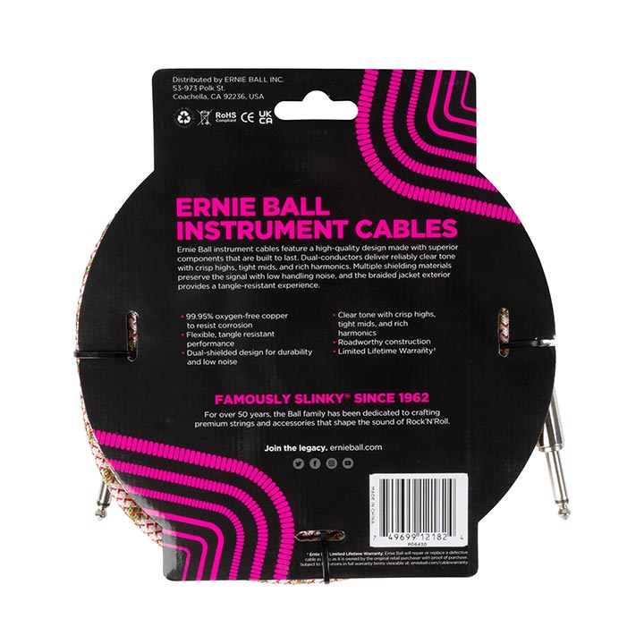 Τα καλώδια οργάνων της Ernie Ball διαθέτουν σχεδιασμό υψηλής ποιότητας, και είναι κατασκευασμένα από ανώτερης ποιότητας υλικά , με στόχο την ποιότητα ήχου και τη μεγάλη διάρκεια ζωής.Οι διπλοί αγωγοί παρέχουν αξιόπιστο καθαρό ήχο με crispy πρίμα, σφιχτά μεσαία και πλούσιες αρμονικές. Πολλαπλά υλικά θωράκισης διατηρούν το σήμα με χαμηλό θόρυβο,ενώ το εξωτερικό πλεκτό περίβλημα παρέχει μια εμπειρία ανθεκτικότητας.Μήκος 5,50 μ.