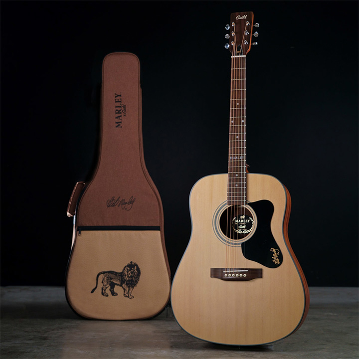 Βασισμένη στην κιθάρα που έπαιζε καθημερινά ο Bob Marley , και με την οποία εμπνεύστηκε δεκάδες τραγούδια του, η Guild A-20 Marley είναι ένας αντάξιος φόρος τιμής στον θρύλο της reggae. Πολλές από τις επιτυχίες του Marley στη δεκαετία του ’70 γράφτηκαν στην ακουστική κιθάρα του, Guild Madeira. Η A-20 Marley επανασυστήνει στον κόσμο την αγαπημένη dreadnought του Marley μαζί με μερικά σύγχρονα χαρακτηριστικά. Κατασκευασμένη με καπάκι από μασίφ έλατο, και πλάτη/ πλαϊνά από μαόνι, ο γεμάτος και δυνατός τόνος της, παρέχει στους θαυμαστές του Marley, και τους τραγουδοποιούς, μια εύκολη στο παίξιμο, καλά ισορροπημένη ακουστική κιθάρα. Το μπράτσο σε σχήμα C με μήκος κλίμακας 25 ½” προσφέρει μια χαλαρή και άνετη αίσθηση. Τα μοναδικά χαρακτηριστικά της περιλαμβάνουν ένα vintage , επίπεδο, στρογγυλεμένο headstock με vintage λογότυπο Guild, custom pickguard με την υπογραφή Bob Marley, και ένα μοναδικό inlay MARLEY στο 12ο τάστο. Τα πρόσθετα χαρακτηριστικά περιλαμβάνουν ταστιέρα και καβαλάρη από pau ferro, κοκκάλινο nut και saddle, και ματ φινίρισμα πολυουρεθάνης. Διατίθεται σε Φυσικό. Ως αποτέλεσμα της αγάπης του Bob Marley για τη μουσική και τον πλανήτη, η κιθάρα περιλαμβάνει μια premium θήκη μεταφοράς, Marley X Guild κατασκευασμένη από ανακυκλωμένο νάιλον. Επιπλέον, η Guild έχει συνεργαστεί με την One Tree Planted για να φυτέψει ένα δέντρο για κάθε κιθάρα Marley που κατασκευάζεται. Το φυλλάδιο που περιλαμβάνεται περιέχει την ιστορία της Marley’s Guild Madeira, ιστορίες από πρώτο χέρι από την οικογένειά του, λεπτομέρειες για τον τρόπο κατασκευής της A-20 Marley και επίσημες συγχορδίες για μια από τις μεγαλύτερες επιτυχίες του Bob Marley. Τρεις custom πένες, με ένα λιοντάρι και το Guild G-Shield με χρυσό μελάνι,περιλαβάνονται επίσης, και τέλος, μια αποκλειστική αφίσα με τον Bob Marley και την πρωτότυπη Guild του, περιλαμβάνεται για να τιμήσει την κληρονομιά ενός από τους μεγαλύτερους τραγουδοποιούς του κόσμου.