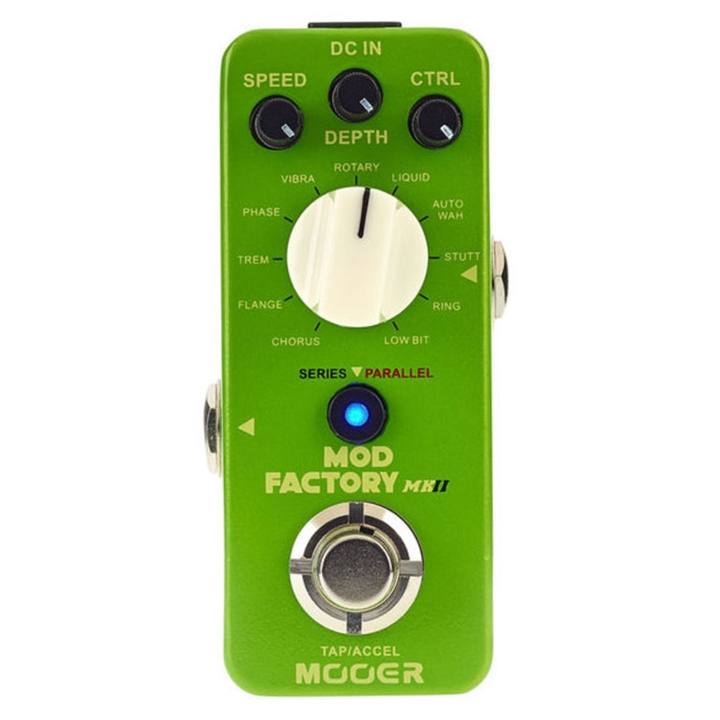 Το Mod Factory MKII περιέχει 11 αλγόριθμους παρμένους κατ ‘ευθείαν από το βραβευμένο MOD FACTORY PRO. Όλοι οι «συνήθεις ύποπτοι» είναι εκεί, όπως Chorus, Flange, Trem και Phase, αλλά επίσης και ένα νέο cool low-bit εφφέ, καθώς και το ring modulator ,που έχουν αποδειχθεί πολύ δημοφιλή με την έκδοση PRO.