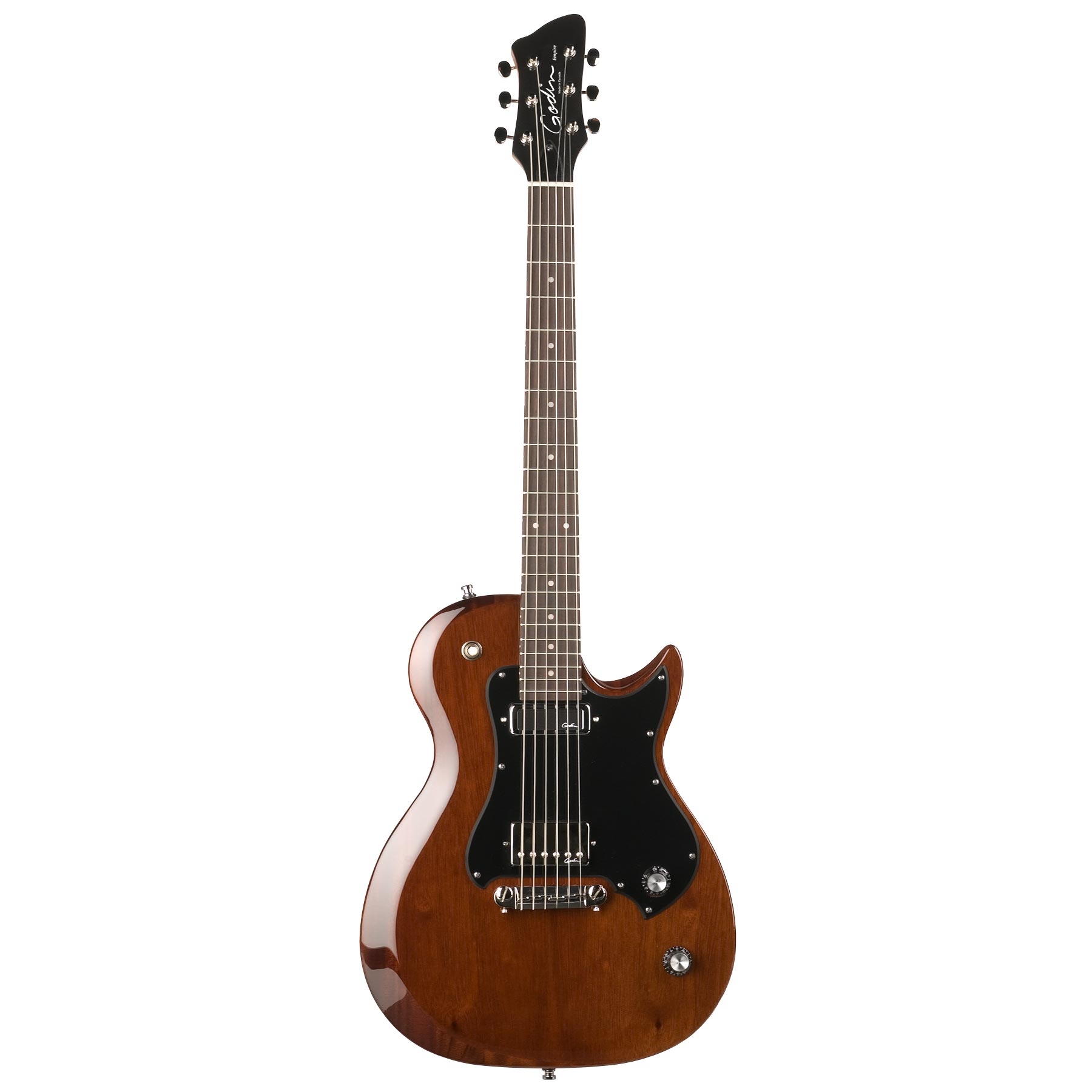 The Godin Richmond Empire has a retro style and attitude all its own and it packs a tonal punch” that won’t hurt your wallet! The Empire features a 24 3/4” scale, a low noise single-coil pickup and a Custom Godin humbucker in the bridge. Pickups are housed in a single cutaway solid body with a silver leaf maple center and poplar wings or the solid mahogany body of the Empire mahogany HG. The pickups are controlled by separate volume and tone knobs, along with a 3-way toggle switch. The Empire’s bolt-on mahogany neck features the worn in feel of an Ergocut rosewood fingerboard for an incredibly comfortable playing experience. These retro rockets are finished off with high-ratio tuning machines, a chrome wraparound bridge and black or Nordic white pickguards depending on the finish. Specs: