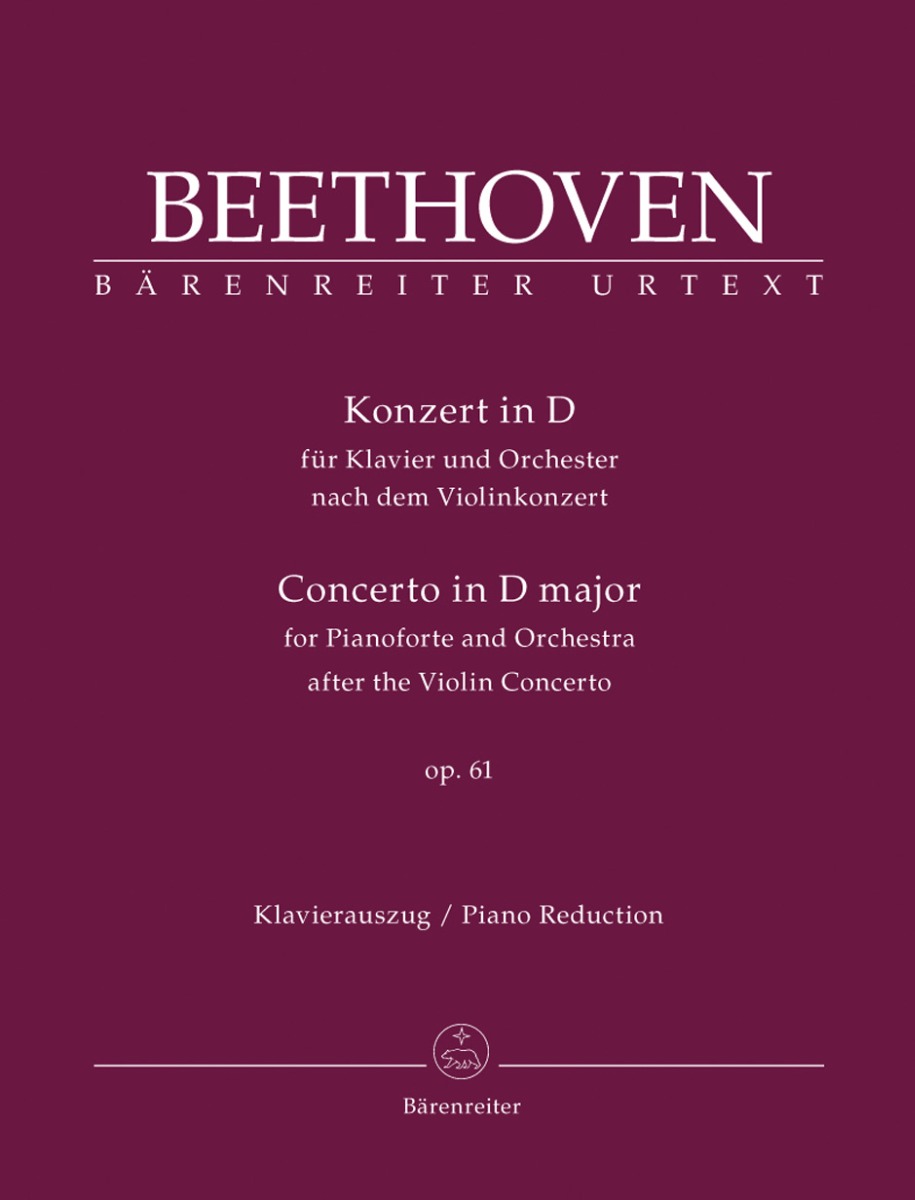 Beethoven, Ludwig vanConcerto for Pianoforte and Orchestra in D major op. 61 after the Violin Concerto- High quality Bärenreiter Urtext edition- Urtext solo piano part and an additional piano part with fingering- New kind of presentation of the piano reduction incorporating solo piano parts as customary in the 19 th century