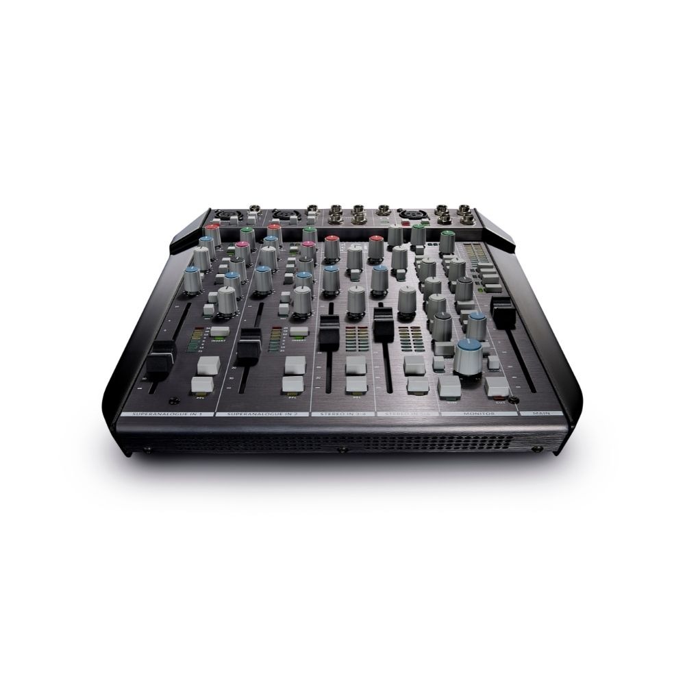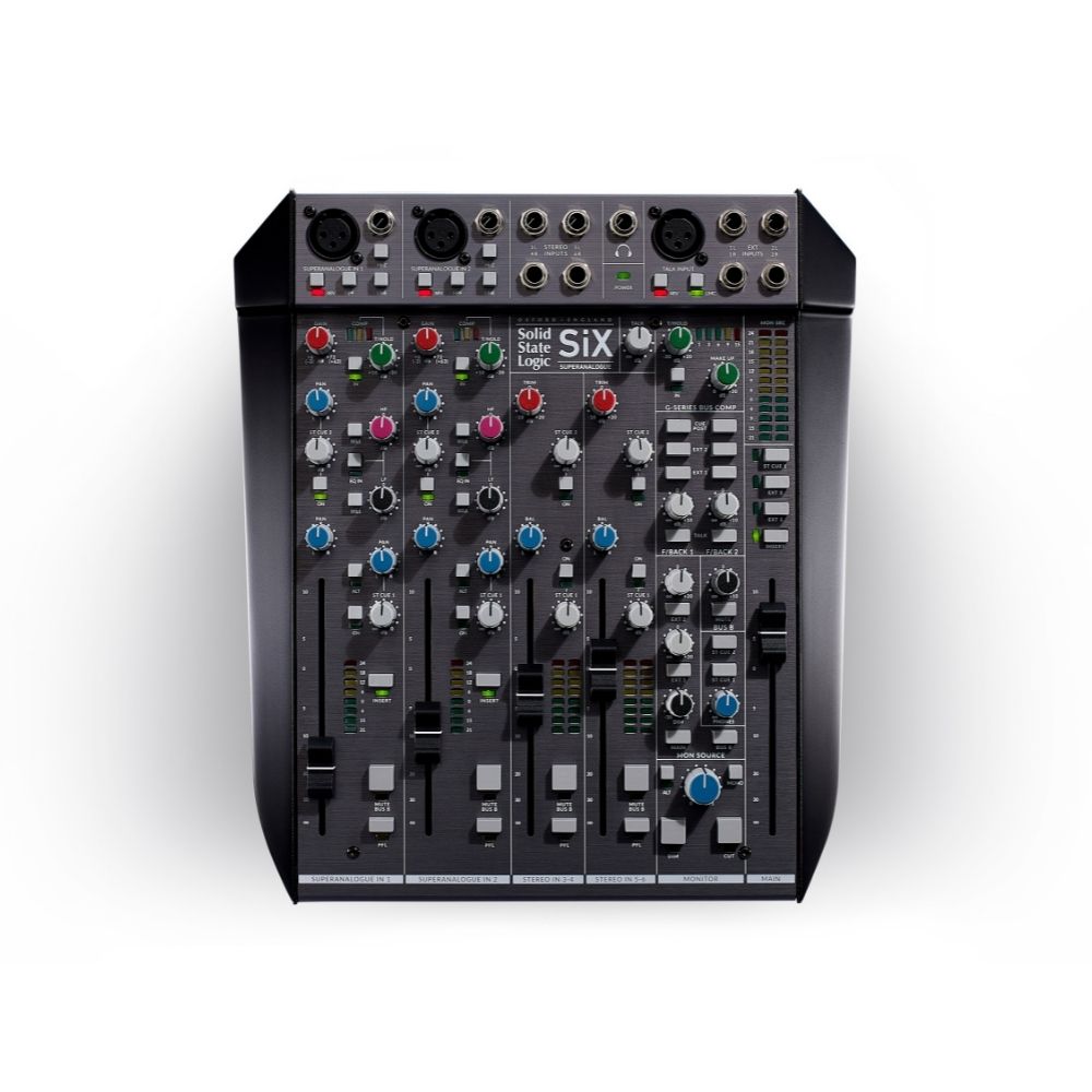 SiX is a condensed professional console for use in the studio, in post-production, on stage, and for podcasting. SiX offers big console sound and an impressive set of utility features in a format that is small enough to stick in a bag a go wherever you need it. SiX is stunning value; it offers two recording channels with SuperAnalogueTM mic pres, two band EQ, an essential one knob version of the classic SSL Channel Compressor, a new two-band Channel EQ, inserts and 100mm faders.